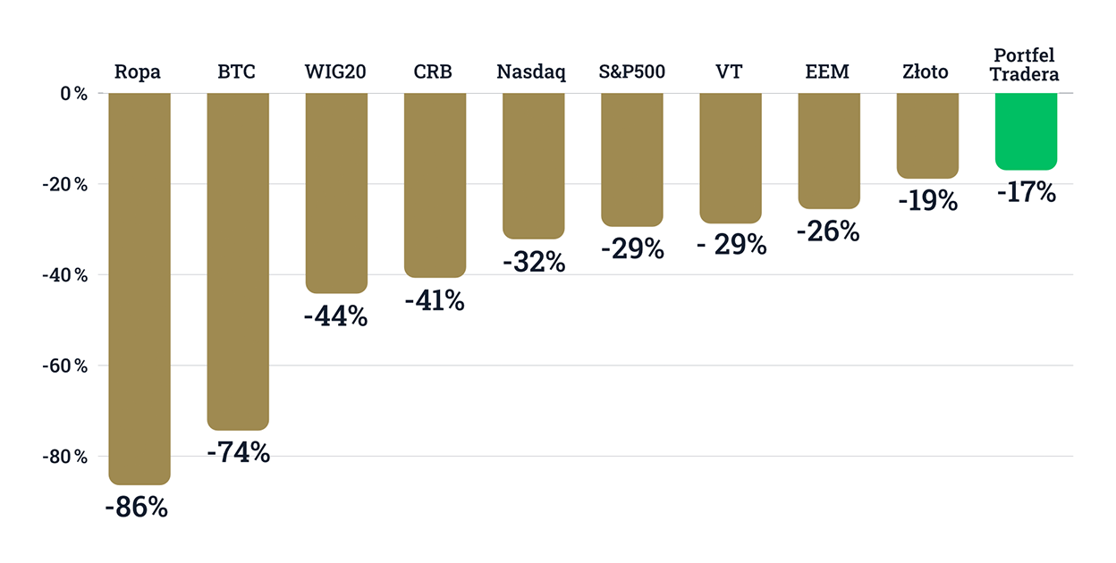 Jak widać, największą stabilnością wykazało się złoto, które w ujęciu złotówkowym potaniało maksymalnie o 14%. Mój portfel spisał się niewiele gorzej i na moment obsunął się o 17%. Diametralnie inaczej wyglądało to chociażby w przypadku popularnych spółek technologicznych, które w pewnym momencie traciły niemal 30%. Skrajne przypadki to Bitcoin oraz ropa naftowa (odpowiednio spadki o 74% oraz 86%, a w przypadku tego ostatniego aktywa wielu spekulantów straciło cały majątek).